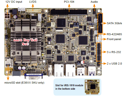 | NANO-BT-i1-N28071-R11 | EPIC SBC supports Intel 22nm Dual-Core Celeron N2807 1.58GHz (4.5W) on-board SoC with VGA/HDMI/LVDS, Dual PCIe GbE, USB 3.0, Dual PCIe Mini, SATA, mSATA , COM, iRIS-1010, audio and RoHS |