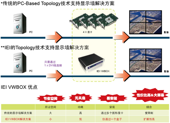 威强VWBOX系列多屏显示墙控制器屏弃传统烦琐的PC多显卡拓扑结构,仅通过一个控制盒即可实现多屏幕拼接显示,可大大减少整个大屏幕显示系统的成本。