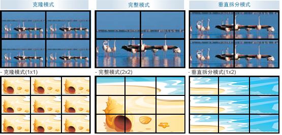 威强VWBOX系列多屏显示墙控制器支持多种显示模式:克隆,完整,垂直拆分,适合不同环境下的各种应用要求。 |