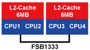 Intel Core 2 Quad with a total of 12 MB L2 cache. Four processing units are packed inside a single CPU package. | | |