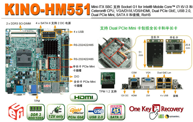 KINO-HM551:支持Intel® mobile Core™ i7/i5/i3 处理器的Mini-ITX主板