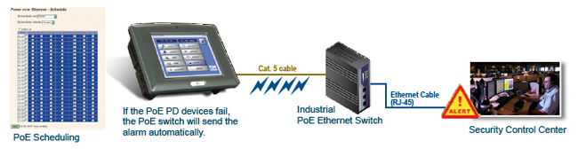 | 如果 AFL-057A与Lite-managed PoE以太网交换机(IPS的- 2042TX)连接失败,交换机将自动发送警报。该PoE交换机将依据用户的设置进行重启或关闭设备。用户还可以设置POE设备的开机时间,使PoE设备定时开机。 |