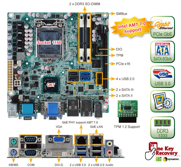 Mini-ITX SBC supports LGA1155 Intel® Core™ i7/i5/i3 CPU, DDR3, VGA/DVI-D, 2COM, Intel GbE, SATA 6Gb/s, USB 3.0, HD Audio and RoHS |