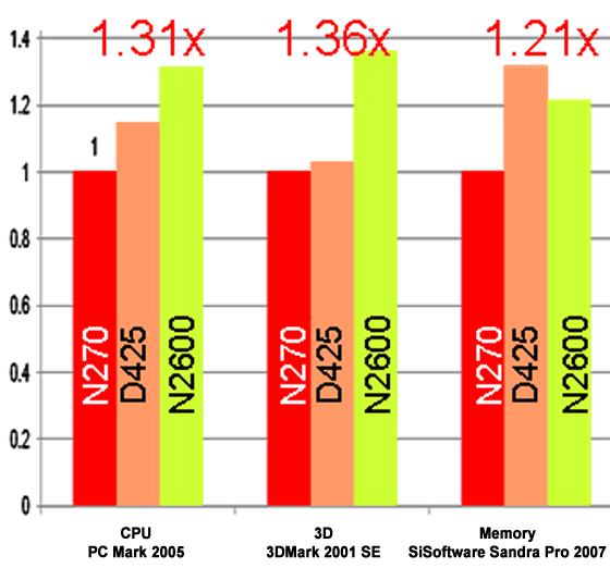 高性能 ‧N2600 CPU 性能优于 N270 31% ‧图形性能优于 N270 36% ‧内存性能优于 N270 21% | |