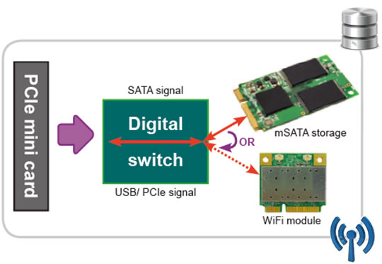 PCIe mini 接口提供 SATA 信号如 mSATA 存储或 WIFI 模组支持全长或半长设备.