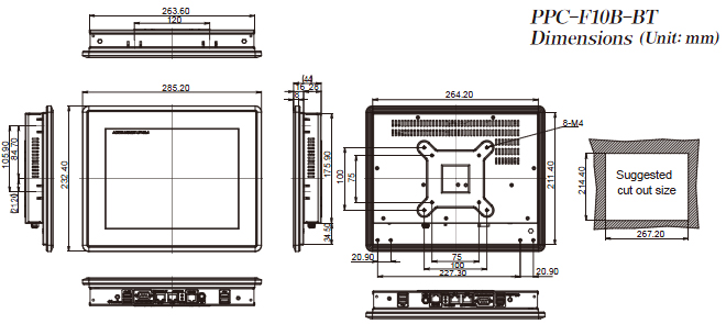 | 型号 | PPC-F10B-BT | | LCD | LCD 显示 | 10.4” | | 最大分辨率 | 800 (W) x 600 (H) | | 亮度 (cd/m²) | 400 | | 对比率 | 700:1 | | LCD 颜色 | 16.2M | | Pixel Pitch (mm) | 0.264(H) x 0.264(V) | | Viewing Angle (H-V) | 160° / 140° | | Backlight MTBF (Hrs) | 30000 | | 主板 | CPU | Intel® Celeron® J1900 on-board SoC quad-core, 2GHz | | RAM | 2 x 204-pin DDR3L SO-DIMM slot (max. 8GB) | | 触摸 | 触摸屏 & 控制器 | 5-wire resistive type flat touchscreen | | 面板硬度 | 3H | | 输入接口 | I/O 接口 & 开关 | 1 x RS-232 COM port (RJ-45 connector) 1 x RS-232/422/485 COM port (DB9 connector) (RI/5V/12V) 2 x USB 2.0 2 x USB 3.0 2 x GbE LAN 1 x Power switch 1 x Reset button 1 x AT/ATX switch 1 x Audio port (line-out) 1 x 9 V~30 V lockable power jack | | 扩展 | 1 x Full-size PCIe Mini slot (with mSATA/PCIe/USB signal) 1 x Half-size PCIe Mini slot for Wi-Fi modules | | Wireless LAN | SMA antenna (optional) | | 存储 | SSD | mSATA | | HDD | 1 x 2.5” HDD bay | | 物理属性 | 材质 | Aluminum front bezel | | 安装 | Stand/ Panel Mount/Rack Mount/ VESA 75*75/100*100 Mount | | 外壳颜色 | Black C | | 尺寸 (mm) | 232.4 x 285.2 x 44 | | 重量 (Net) | 1.77kg | | 开孔尺寸 (mm) | 267.2 x 214.4 | | 环境 | 操作温度 (with air flow) | -10°C~50°C (14°F~122°F) | | 存储温度 | -20°C~60°C (-4°F~140°F) | | 湿度 | 10% to 95% (non-condensing) | | IP 等级 | IP 65 compliant front panel | | 安规和 EMC | CE & FCC Class A certified | | 电源输入 | Power Supply | 9 V~30 V DC | | 功耗 | 40W |